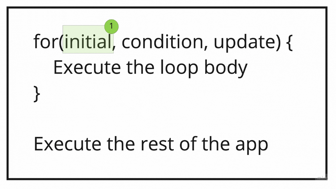 For loop is not as simple as the while and its syntax differs as well. The for loop accepts 3 expressions: The initial expression which executes only once at the beginning of the loop. The second one is the condition expression that executes before every iteration of the loop. The third one is the update expression which executes at the end of every iteration.