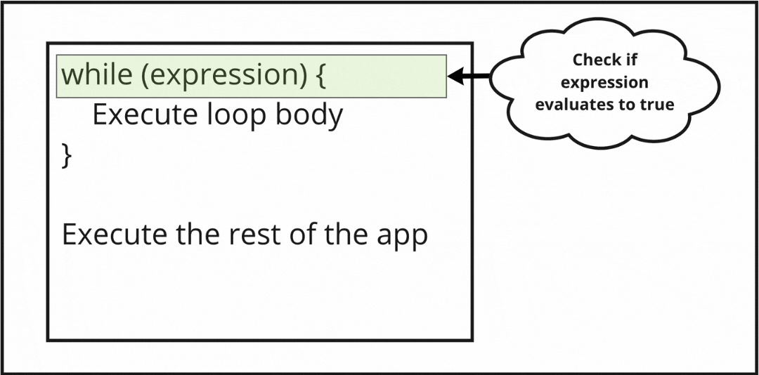 While is very simple and it accepts one argument of type boolean we call it the loop expression. As its name hints: while the expression evaluates to true, it will keep executing the code inside its body